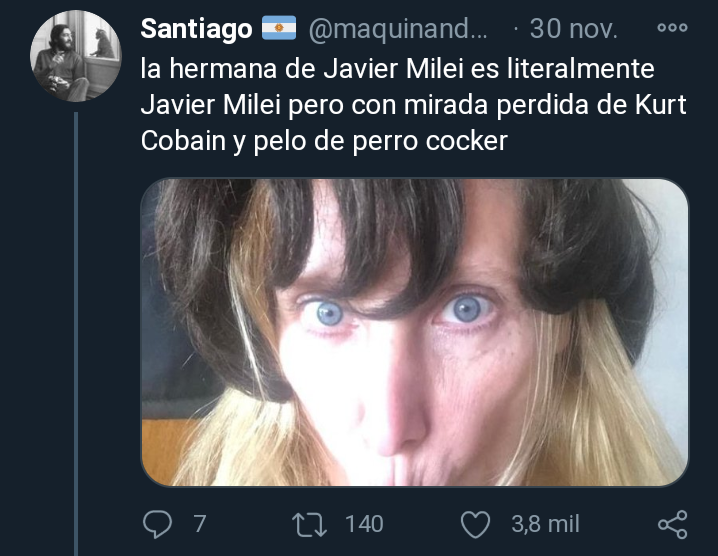 Santiago On Twitter La Hermana De Javier Milei Es Literalmente Javier Milei Pero Con Mirada Perdida De Kurt Cobain Y Pelo De Perro Cocker Https T Co Fvxkwzym3k
